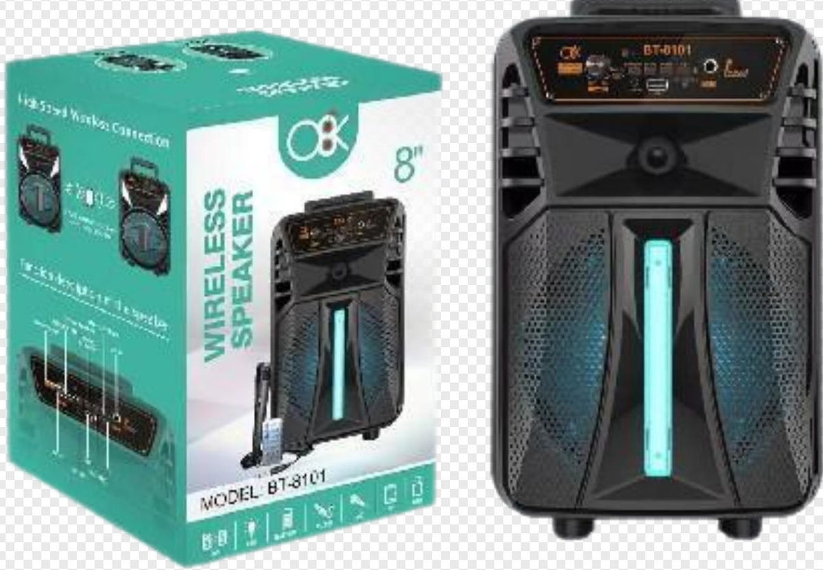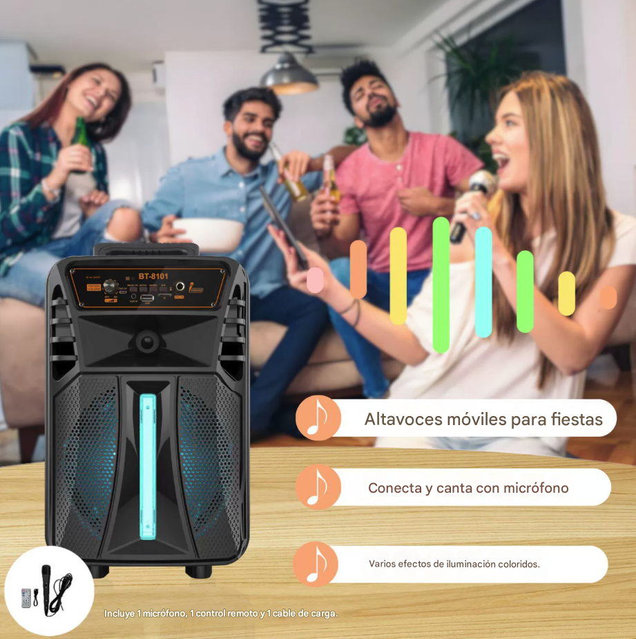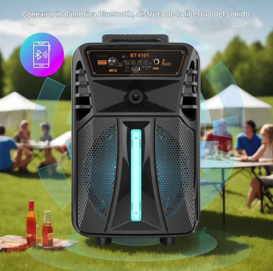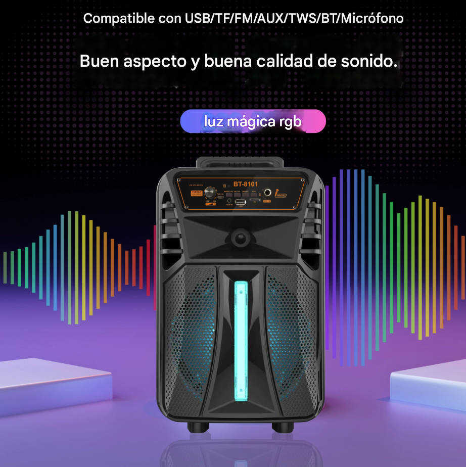 El altavoz Bluetooth portátil de la marca O8K (Modelo BM053), equipado con un potente altavoz grande de 8 pulgadas, ofrece un sonido impresionante y robusto. Cuenta con un sistema de iluminación RGB genial que se mueve al ritmo de la música, encendiendo al instante el ambiente de fiesta. Como dispositivo de entretenimiento multifuncional, soporta conexión Bluetooth inalámbrica y permite la función de karaoke a través del micrófono con cable incluido. Es la opción ideal para fiestas en casa y actividades al aire libre.