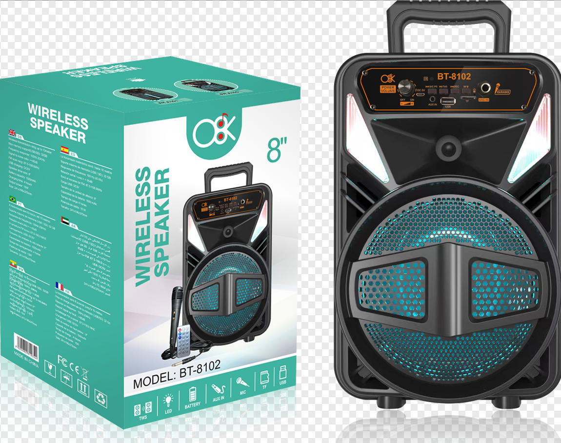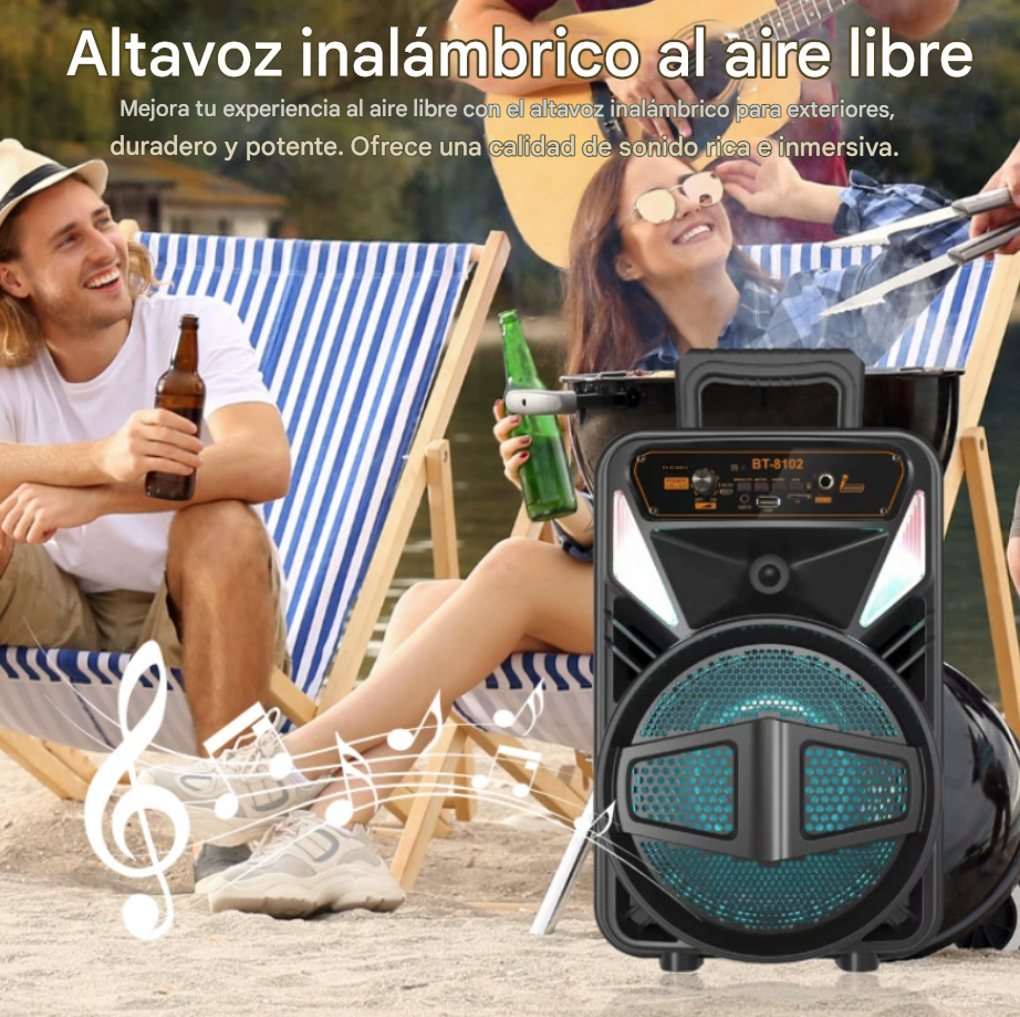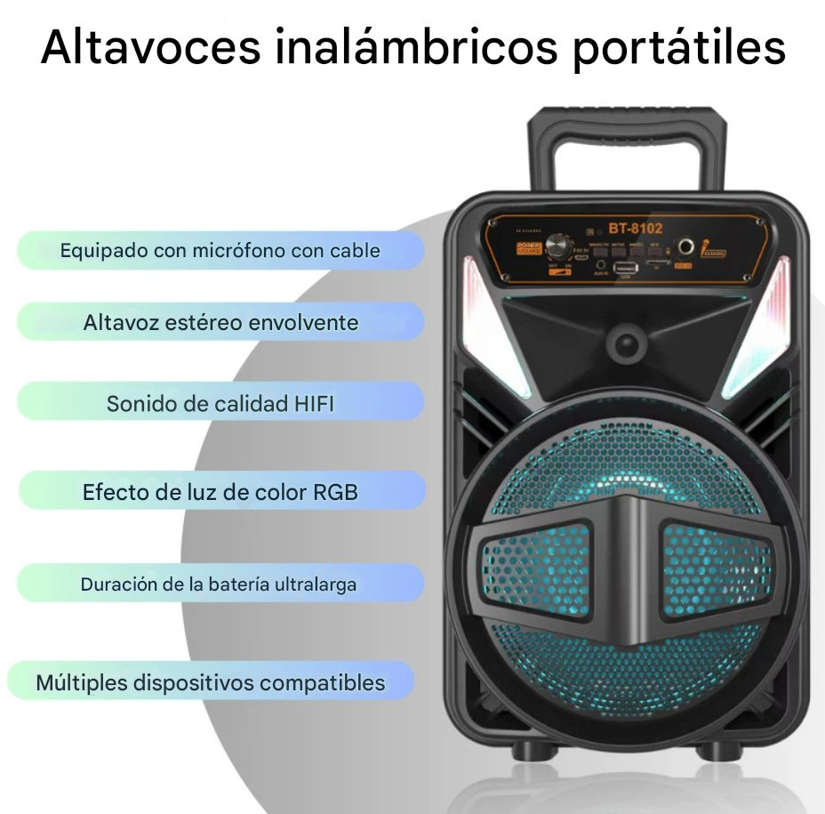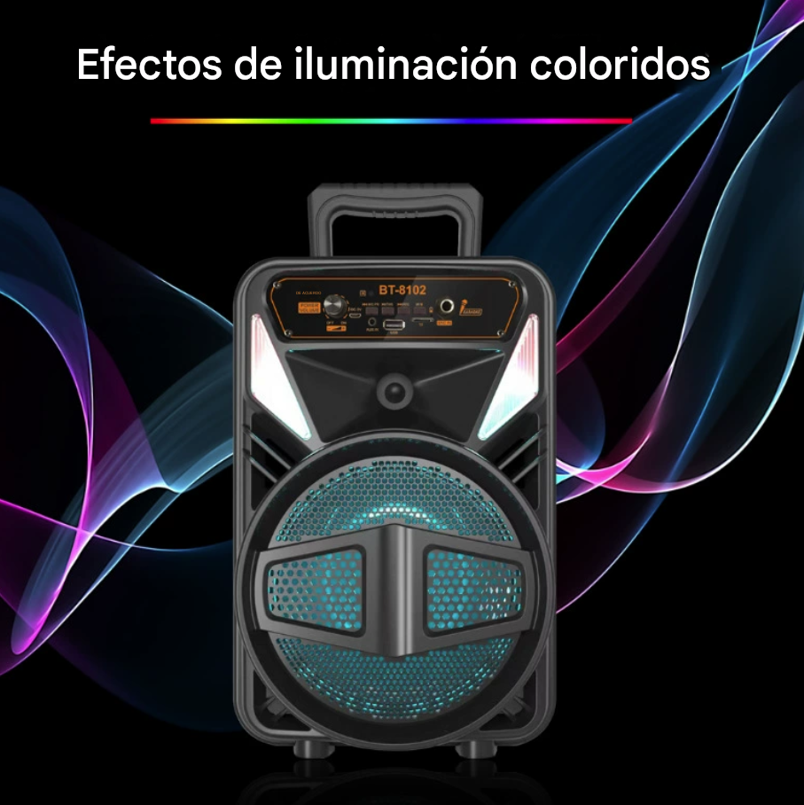 El altavoz Bluetooth portátil de la marca O8K (Modelo BM054), equipado con un potente altavoz grande de 8 pulgadas, ofrece un sonido impresionante y robusto. Cuenta con un sistema de iluminación RGB genial que se mueve al ritmo de la música, encendiendo al instante el ambiente de fiesta. Como dispositivo de entretenimiento multifuncional, soporta conexión Bluetooth inalámbrica y permite la función de karaoke a través del micrófono con cable incluido. Es la opción ideal para fiestas en casa y actividades al aire libre.