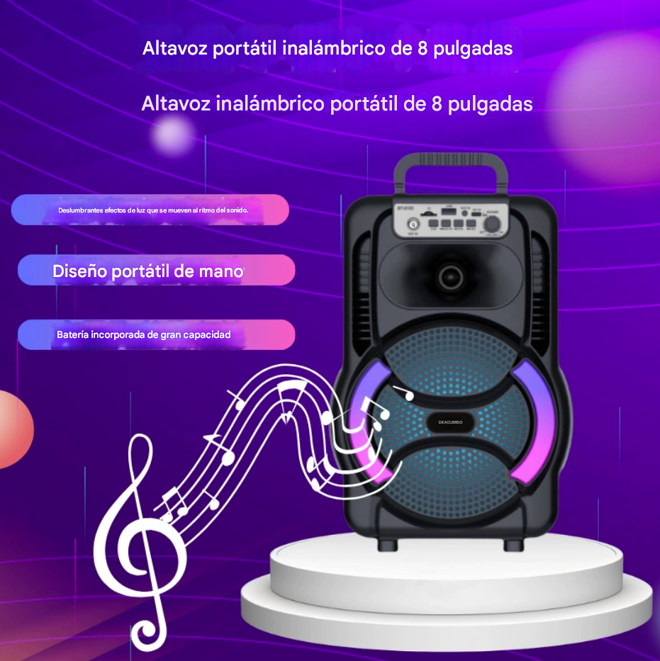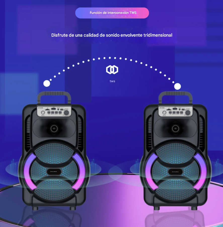 El altavoz Bluetooth portátil de la marca O8K (Modelo BM055), equipado con un potente altavoz grande de 8 pulgadas, ofrece un sonido impresionante y robusto. Cuenta con un sistema de iluminación RGB genial que se mueve al ritmo de la música, encendiendo al instante el ambiente de fiesta. Como dispositivo de entretenimiento multifuncional, soporta conexión Bluetooth inalámbrica y permite la función de karaoke a través del micrófono con cable incluido. Es la opción ideal para fiestas en casa y actividades al aire libre.