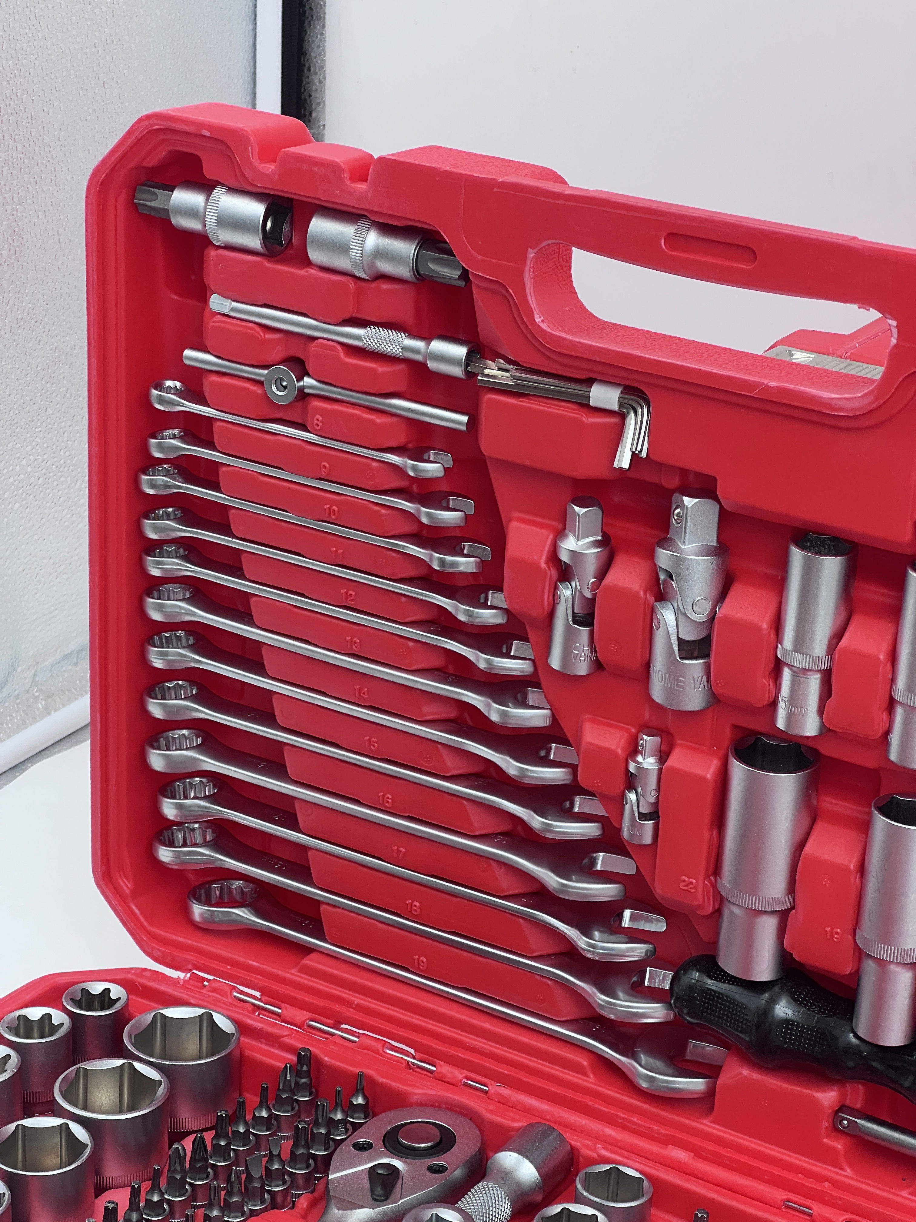 Contenido típico: Llaves, dados, puntas de destornillador, mangos de destornillador, etc.