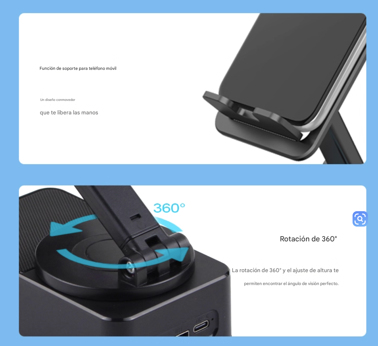 El Soporte con Altavoz Bluetooth DSH1031 combina soporte para teléfono, altavoz Bluetooth y luz LED ambiental en un solo dispositivo. Es ideal para escritorios, mesas de noche u otros espacios de trabajo, permitiendo ver contenido, escuchar música o realizar videollamadas con el dispositivo estable.