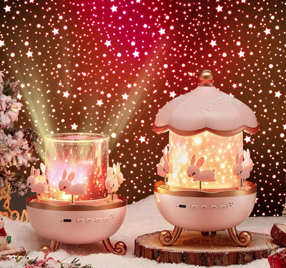 La Lámpara Proyectora de Estrellas con Caja de Música y Carrusel de Conejos, modelo DSH1047, es un regalo de ensueño que combina música, luces y diversión infantil. Integra ingeniosamente la adorable forma de conejo con el clásico diseño de carrusel, siendo tanto una exquisita caja de música como una romántica lámpara proyectora de estrellas. Cuando suena la música, el carrusel gira y simultáneamente se proyectan patrones de estrellas en el techo, creando una atmósfera inmersiva donde se entrelazan el sonido, la vista y la sensación de cuento de hadas, ideal para decorar habitaciones infantiles, regalar o crear un ambiente relajante.