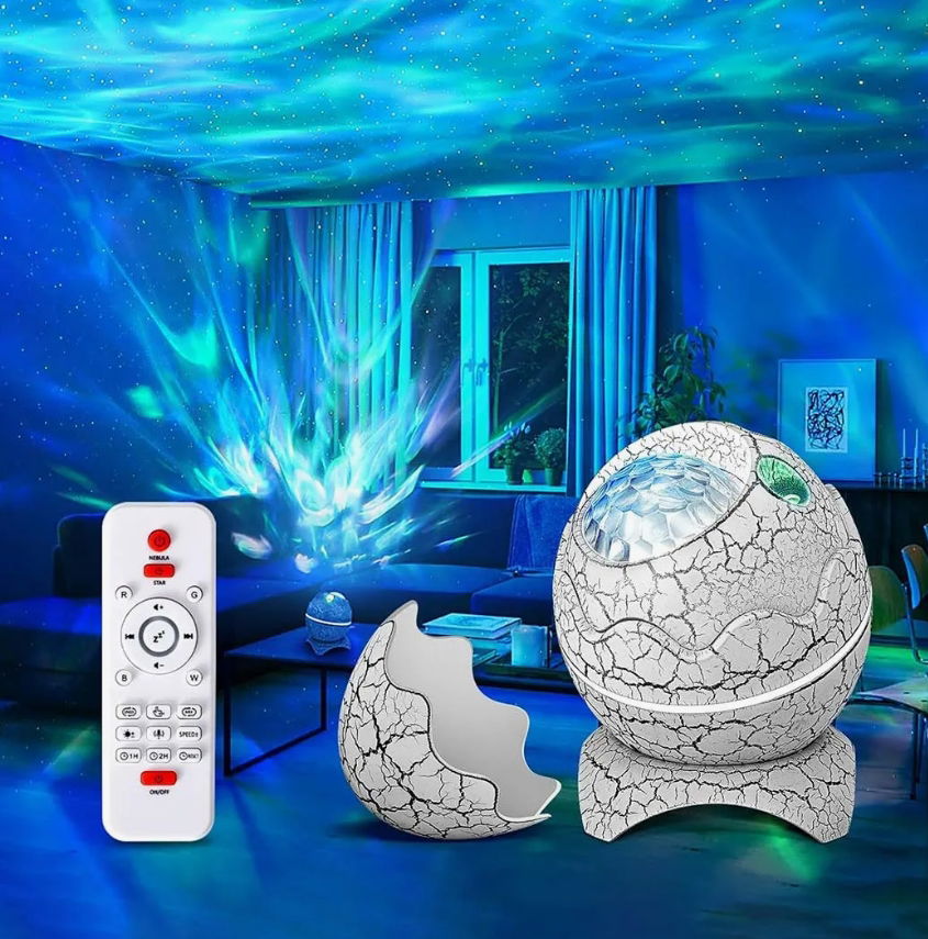 Proyección de estrellas y luces que generan un ambiente relajante.