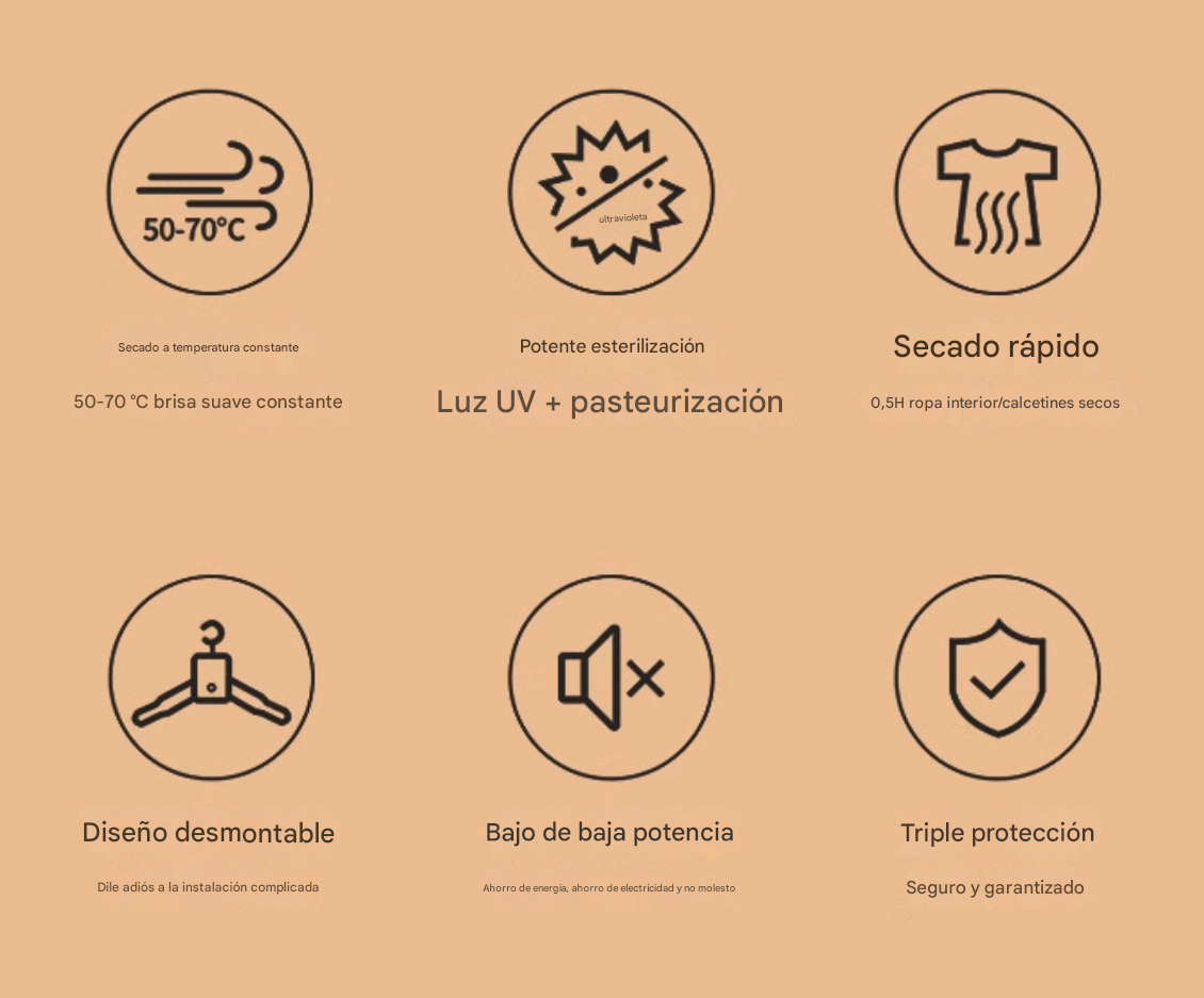 Incluye: Percha secadora JL1021 + adaptador de corriente + manual de usuario