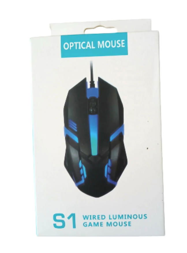 Mouse con cable e iluminación LED incorporada, diseñado para uso en computadoras y notebooks.