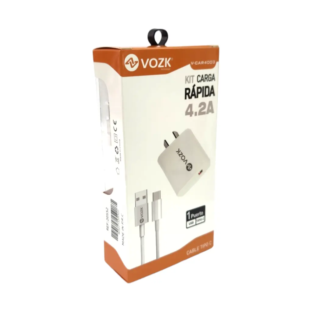 El cargador rápido de la marca VOZK, modelo V-CAR4003TC, es una solución de carga rápida eficiente y conveniente. Soporta una salida de alta corriente de hasta 4.2A y presenta un diseño de un solo puerto de salida de USB a TIPO C, diseñado específicamente para ofrecer una experiencia de carga rápida a dispositivos modernos con puerto Type-C. Compacto y potente, es el compañero ideal para sus viajes diarios y carga eficiente.