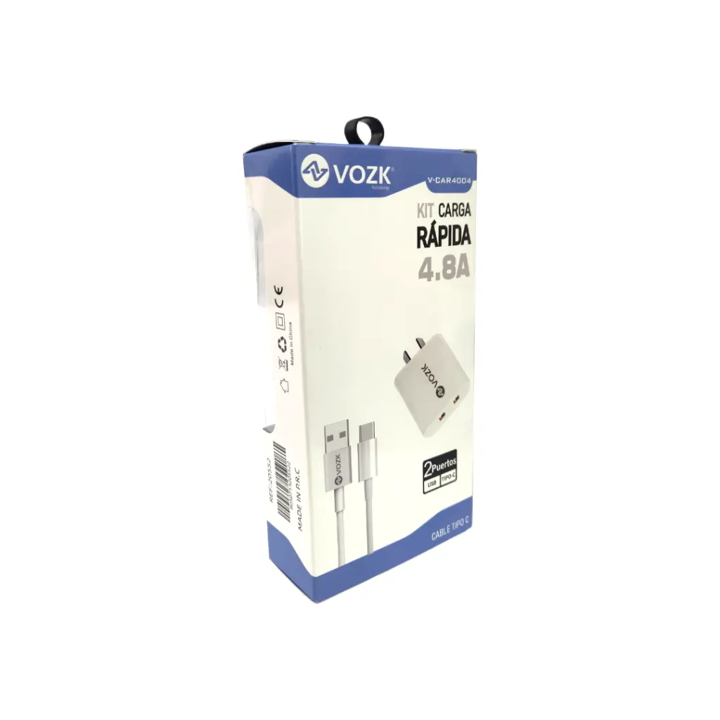 El kit de cargador rápido de la marca VOZK, modelo V-CAR4004TC, es una solución de carga eficiente para múltiples dispositivos. El cargador cuenta con 2 puertos de salida USB con una salida total de hasta 4.8A, capaz de proporcionar carga rápida a dos dispositivos simultáneamente. El kit incluye un cable de USB a TYPE-C de alta calidad, diseñado específicamente para transmitir altas corrientes rápidamente, satisfaciendo su doble necesidad de velocidad y conveniencia.