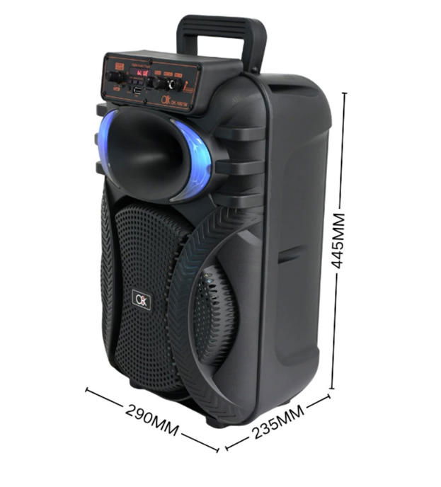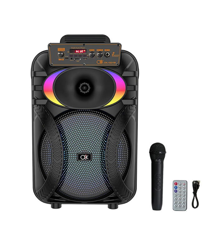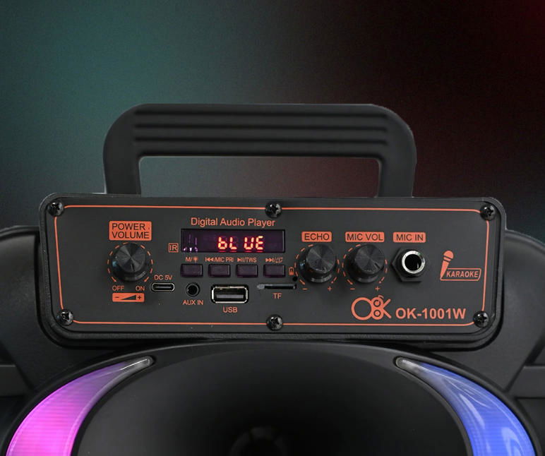 El altavoz Bluetooth portátil de la marca O8K (Modelo BM059), equipado con un potente altavoz grande de 10 pulgadas, ofrece un sonido impresionante y robusto. Cuenta con un sistema de iluminación RGB genial que se mueve al ritmo de la música, encendiendo al instante el ambiente de fiesta. Como dispositivo de entretenimiento multifuncional, soporta conexión Bluetooth inalámbrica y permite la función de karaoke a través del micrófono con cable incluido. Es la opción ideal para fiestas en casa y actividades al aire libre.