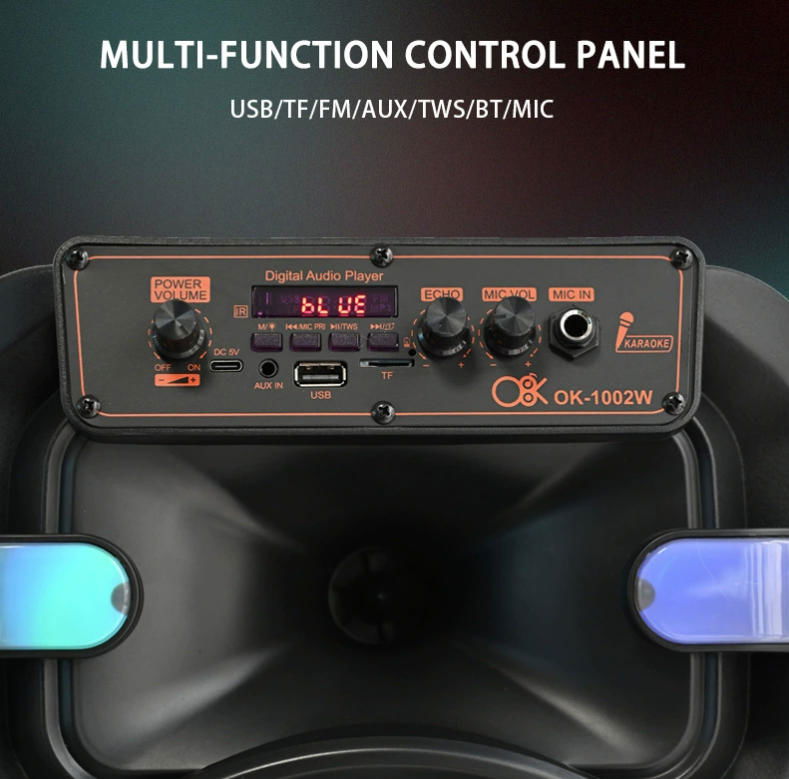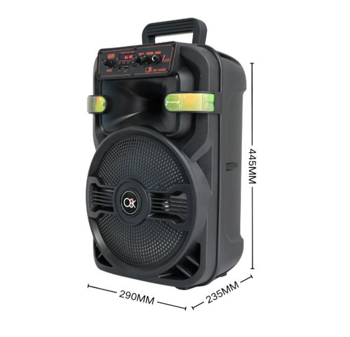 El altavoz Bluetooth portátil de la marca O8K (Modelo BM060), equipado con un potente altavoz grande de 10 pulgadas, ofrece un sonido impresionante y robusto. Cuenta con un sistema de iluminación RGB genial que se mueve al ritmo de la música, encendiendo al instante el ambiente de fiesta. Como dispositivo de entretenimiento multifuncional, soporta conexión Bluetooth inalámbrica y permite la función de karaoke a través del micrófono con cable incluido. Es la opción ideal para fiestas en casa y actividades al aire libre.