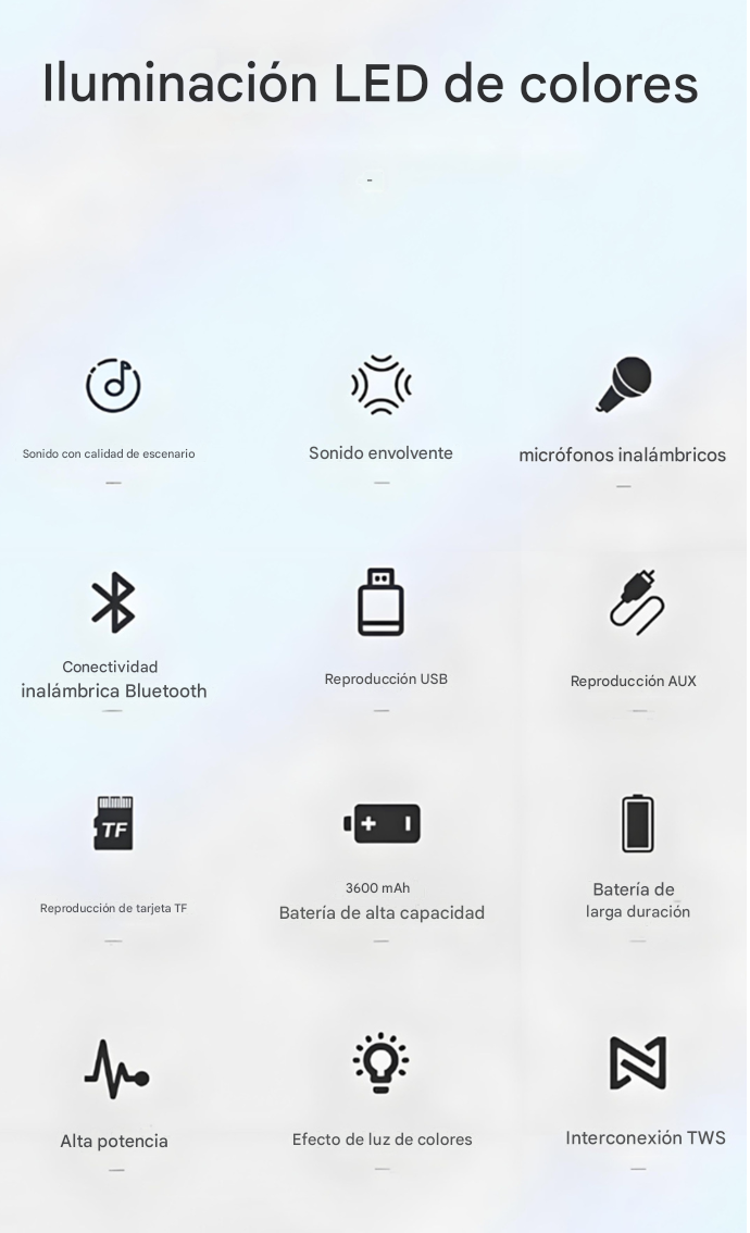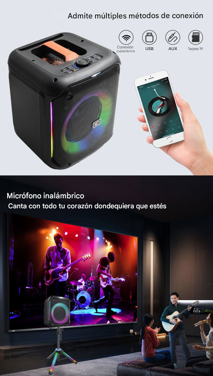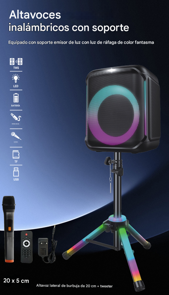 Accesorios incluidos: 1 micrófono, 1 control remoto, Soporte LED