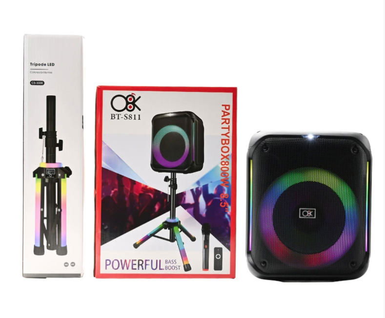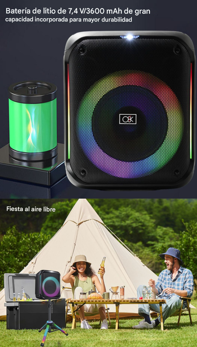 El altavoz Bluetooth de alta potencia de la marca O8K, número de modelo BM062, está equipado con una unidad de graves de 8 pulgadas y un tweeter independiente, proporcionando un sonido potente y equilibrado. Con una gran batería de 3600mAh integrada para una autonomía prolongada. El kit incluye 1 micrófono, 1 control remoto e innovadoramente viene con un soporte LED, combinando iluminación y sonido en uno, siendo el centro todoterreno para entretenimiento y actividades al aire libre.