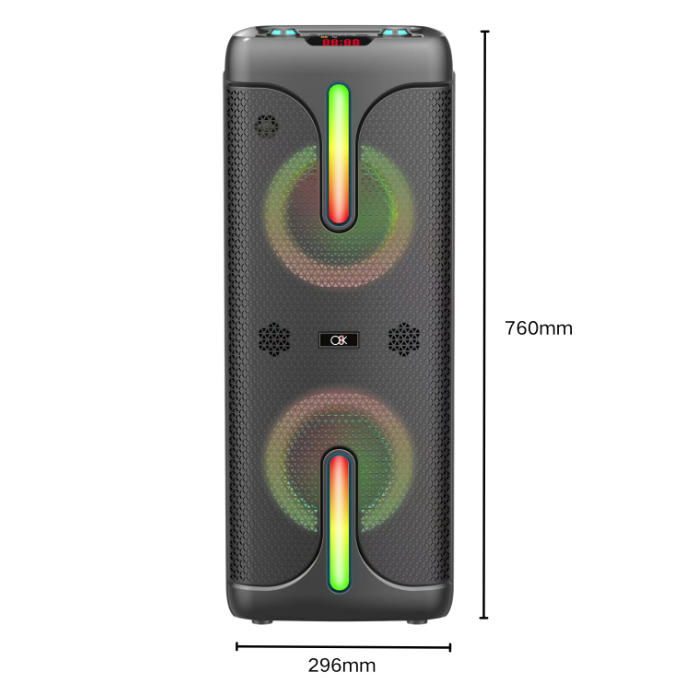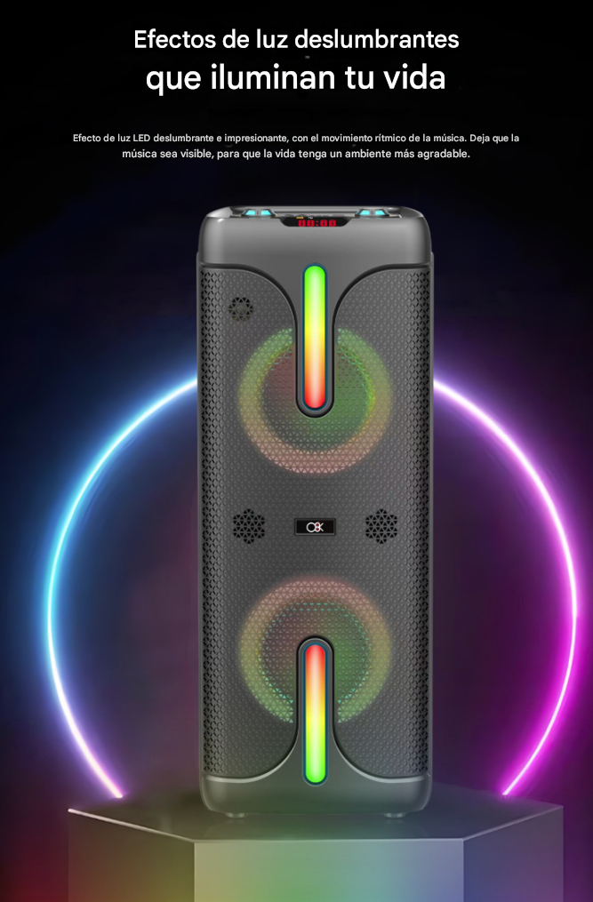 El altavoz Bluetooth doble de 8 pulgadas insignia de la marca O8K, número de modelo BM063, es un equipo de sonido profesional que reúne potencia superior y funcionalidad completa. Equipado con dos unidades de graves de 8,5 pulgadas, presenta una impresionante experiencia auditiva de calidad de sonido HIFI. Cuenta con tecnología de conexión inalámbrica TWS y deslumbrantes efectos de luz RGB. El panel integra 2 grandes perillas con pantalla y 6 botones, compatible con BT/TF/USB/FM/AUX/MIC/TWS/RGB. Es la opción ideal para grandes eventos al aire libre.