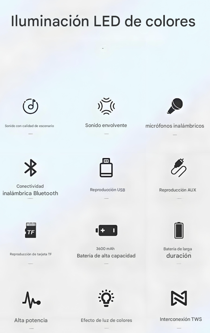 Funciones: BT/TF/USB/FM/AUX/MIC/TWS/RGB