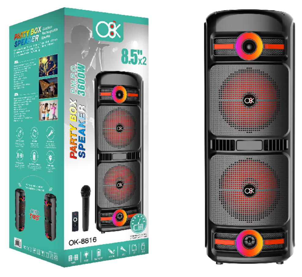 El altavoz Bluetooth doble de 8 pulgadas de la marca O8K, número de modelo BM068, es un sistema de sonido de alta potencia creado para un efecto de sonido supremo. Equipado con dos unidades de graves extra grandes de 8 pulgadas, aporta unos graves impresionantes y un campo de sonido fuerte sin precedentes. Soporta tecnología de conexión inalámbrica TWS y cuenta con efectos de luz RGB dinámicos. El kit incluye 1 micrófono y 1 control remoto, satisfaciendo todas sus necesidades para grandes eventos de entretenimiento al aire libre.