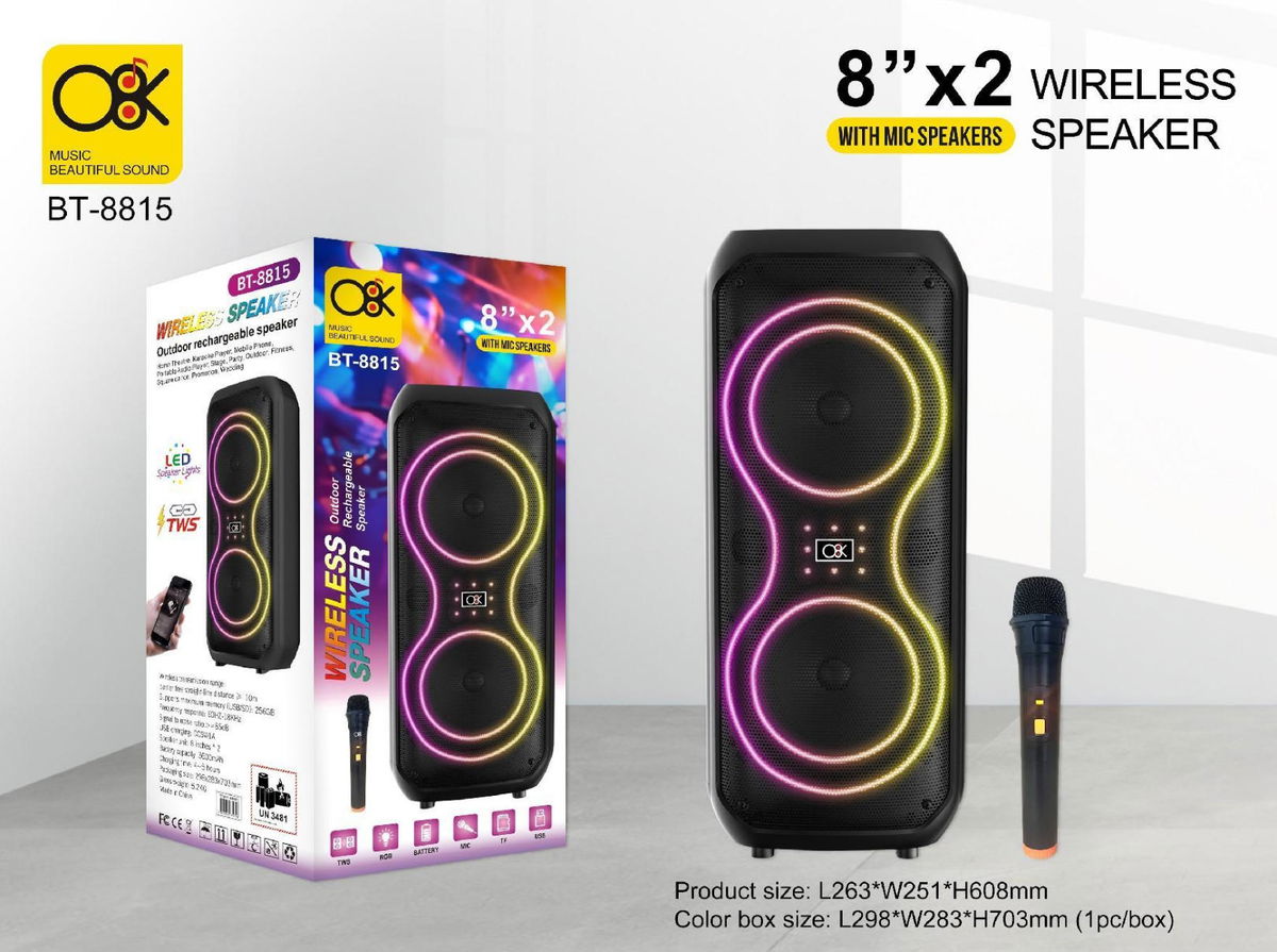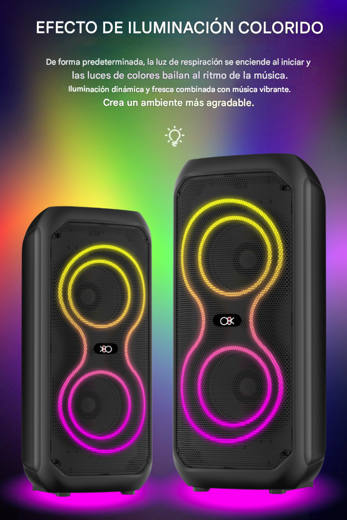 El altavoz Bluetooth doble de 8 pulgadas de la marca O8K, número de modelo BM073, es un sistema de sonido de alta potencia creado para un efecto de sonido supremo. Equipado con dos unidades de graves extra grandes de 8 pulgadas, aporta unos graves impresionantes y un campo de sonido fuerte sin precedentes. Soporta tecnología de conexión inalámbrica TWS y cuenta con efectos de luz RGB dinámicos. El kit incluye 1 micrófono y 1 control remoto, satisfaciendo todas sus necesidades para grandes eventos de entretenimiento al aire libre.