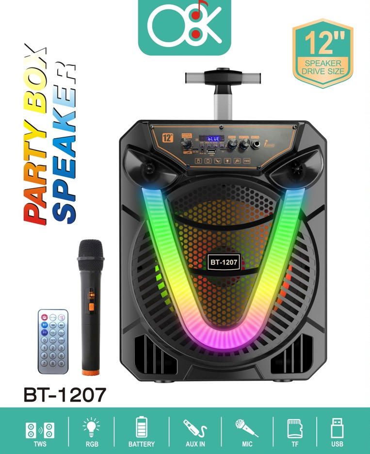 El altavoz Bluetooth 12 pulgadas de la marca O8K, número de modelo BM079, es un sistema de sonido de alta potencia creado para un efecto de sonido supremo. Equipado con una unidad de graves de 12 pulgadas, aporta unos graves impresionantes y un campo de sonido fuerte sin precedentes. Soporta tecnología de conexión inalámbrica TWS y cuenta con efectos de luz RGB dinámicos. El kit incluye 1 micrófono y 1 control remoto, satisfaciendo todas sus necesidades para grandes eventos de entretenimiento al aire libre.