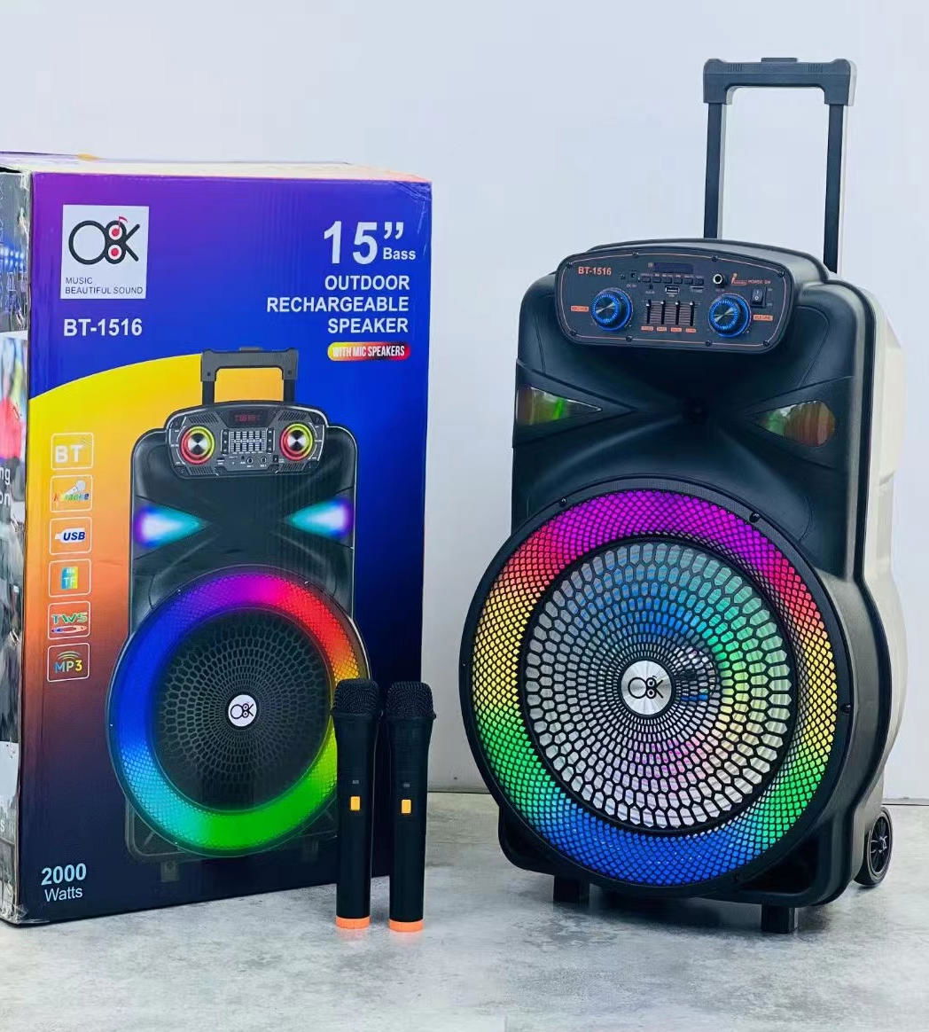 El altavoz Bluetooth con carro, número de modelo BM084 de la marca O8K, es un equipo de sonido profesional diseñado para grandes escenarios móviles al aire libre. Equipado con una enorme unidad de altavoz simple de 15 pulgadas, proporciona una abrumadora presión sonora y un efecto de sonido impactante. Integra un carro y ruedas para un transporte conveniente. Además, cuenta con efectos de luz RGB geniales e incluye de serie 2 micrófonos y 1 control remoto. Es un potente sistema de sonido e iluminación para baile en plazas, actuaciones al aire libre y grandes fiestas.