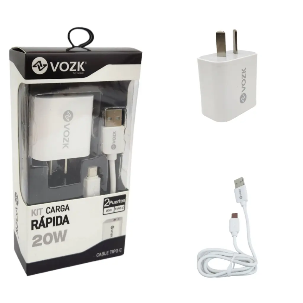 El cargador de pared VOZK de 20W con cable incluido es una solución de carga eficiente y conveniente. El kit incluye un cubo de carga con dos puertos de salida y un cable USB a TIPO C. Con tecnología de carga rápida de 20W, puede carcar rápidamente dispositivos Apple compatibles. Su diseño de doble puerto permite alimentar dos dispositivos simultáneamente, satisfaciendo las necesidades diarias de usuarios con múltiples gadgets.