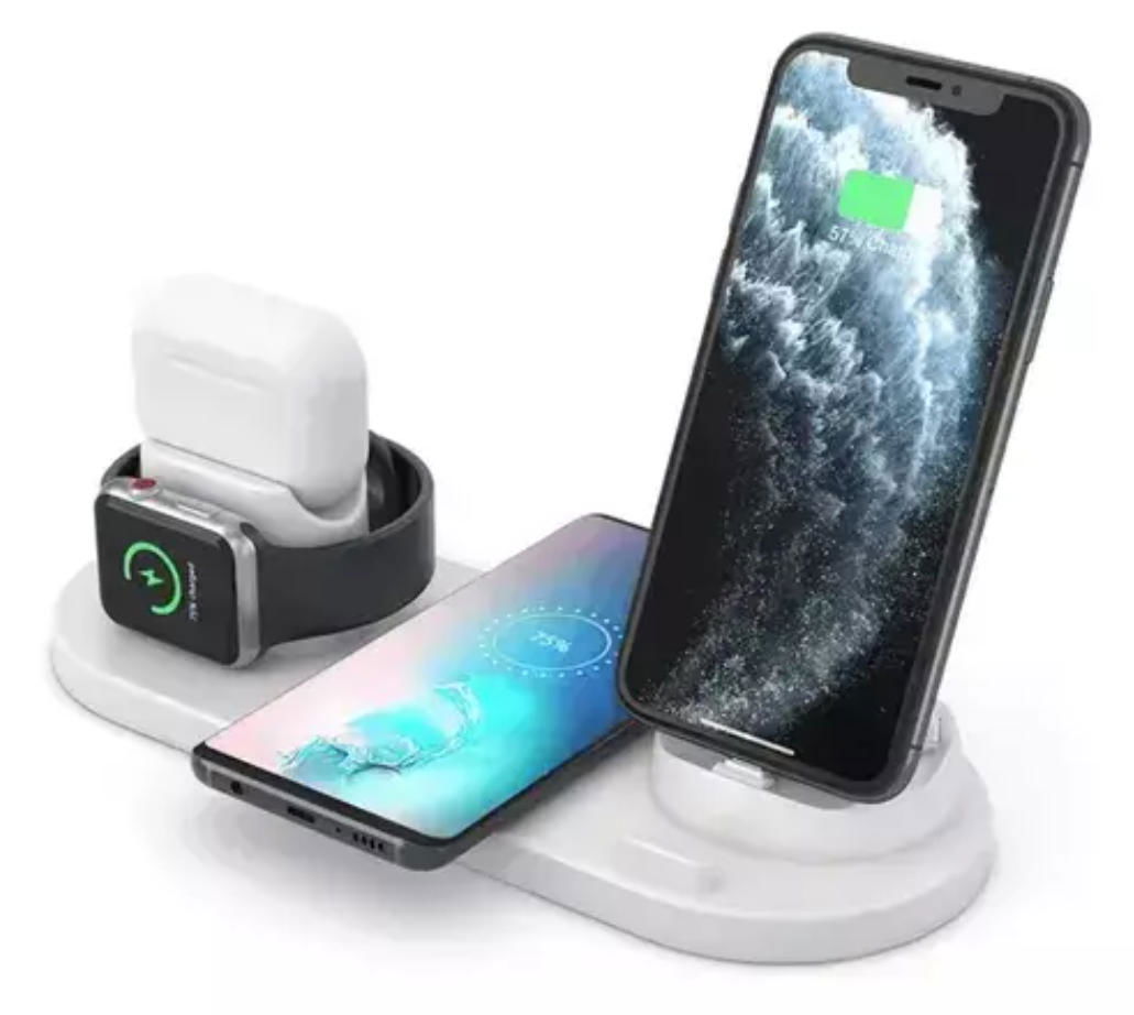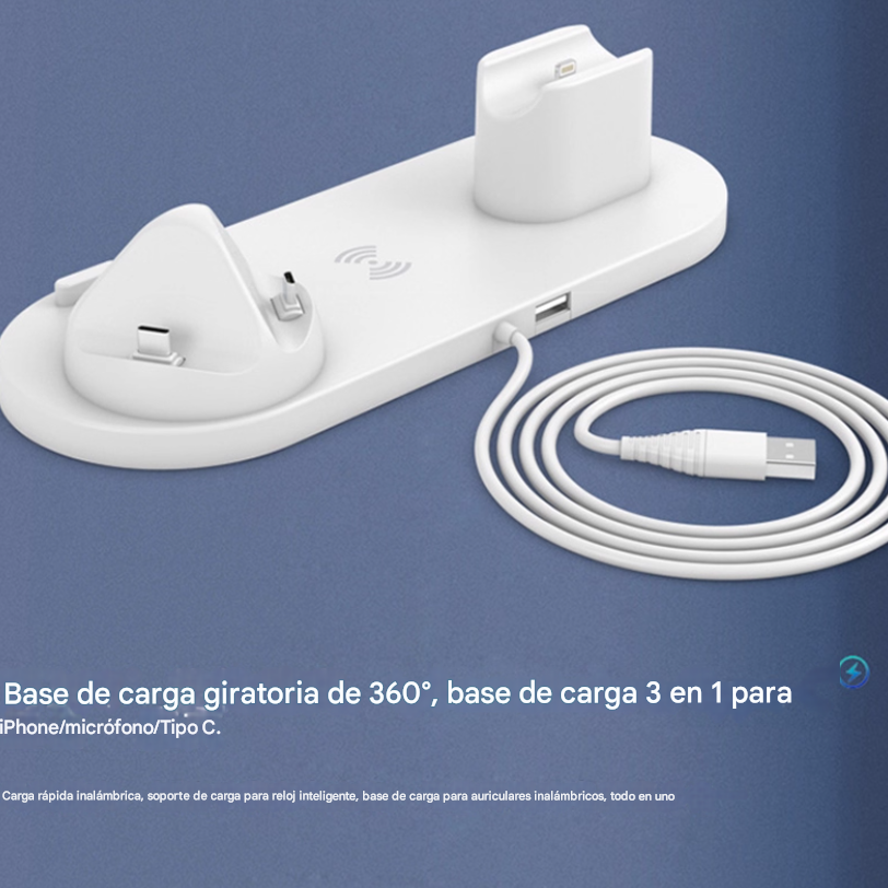 Cargador 3 en 1 diseñado para cargar de manera simultánea celular, reloj inteligente y auricular inalámbrico.