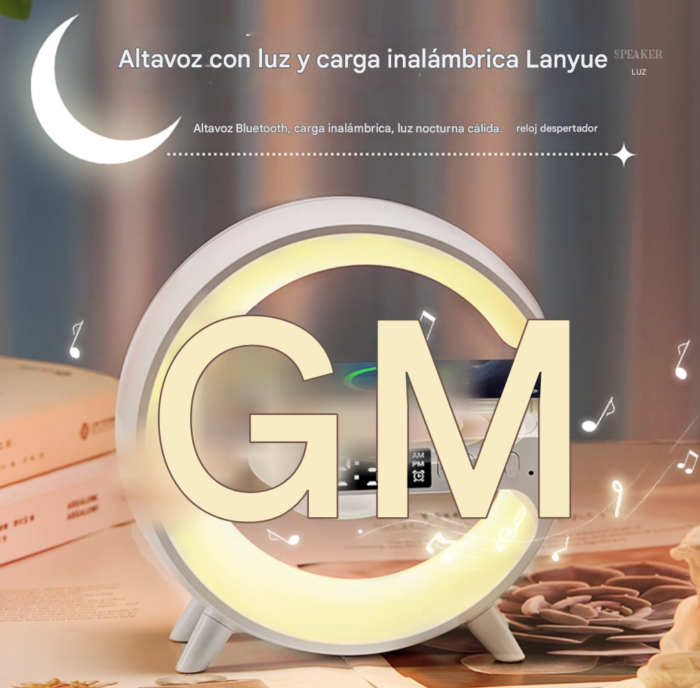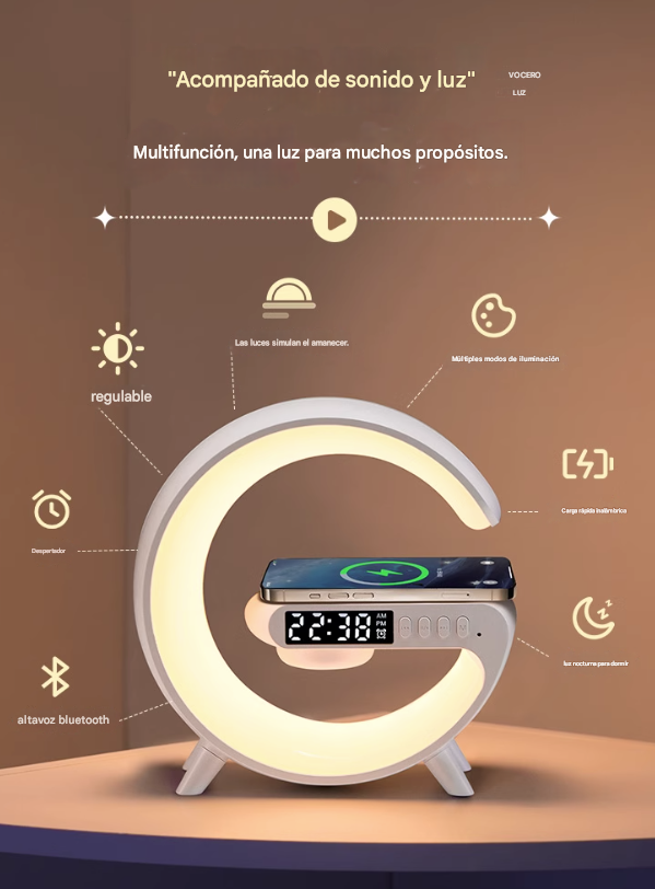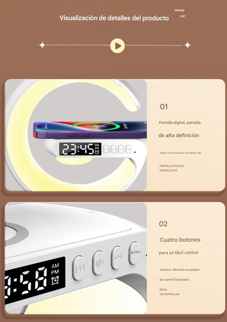 Funciones: Reloj, lámpara LED, parlante Bluetooth, base de carga inalámbrica