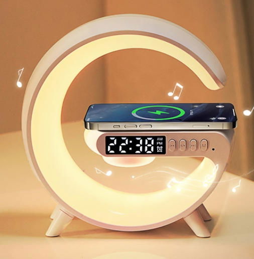 4 en 1: Reloj + Lámpara LED RGB + Parlante Bluetooth + Base de carga inalámbrica.