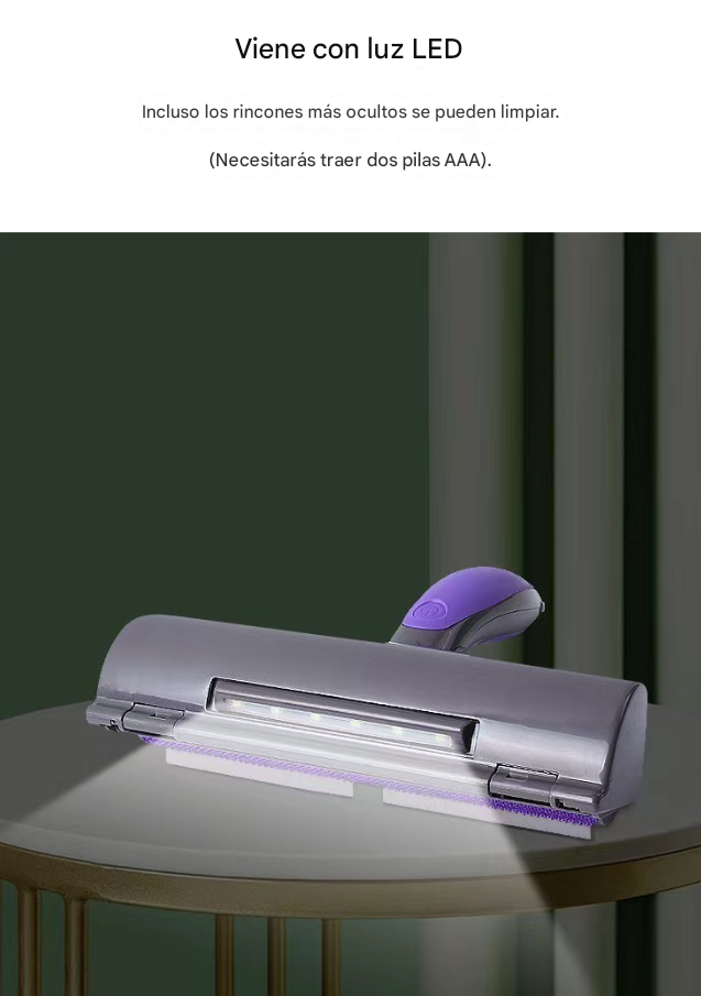 Limpieza con luz LED: La luz LED integrada ilumina la superficie a limpiar, detectando sin esfuerzo pelusas y polvo finos en cada rincón.