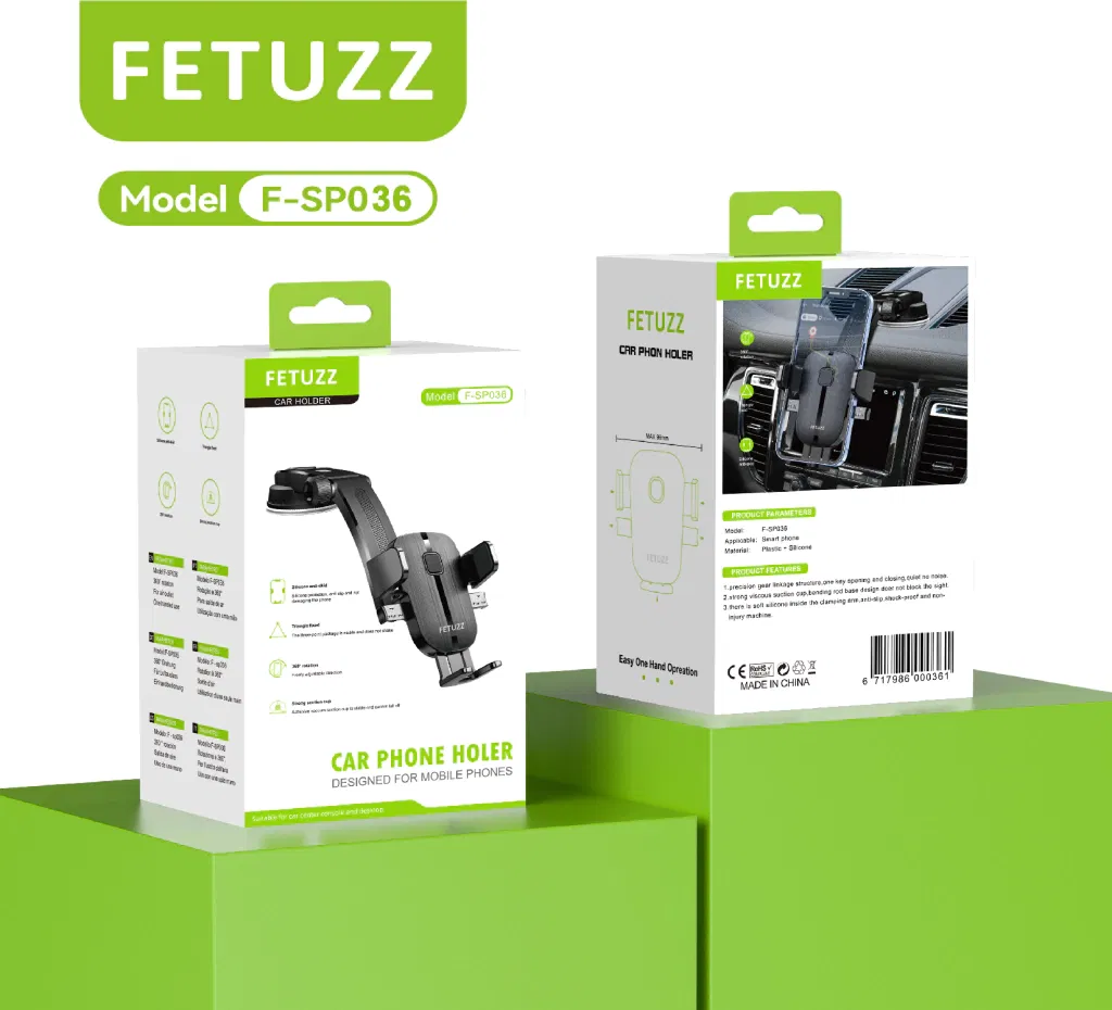 El soporte para móvil de coche con ventosa de la marca FETUZZ, modelo F-SP036, está diseñado para un uso seguro y conveniente en el automóvil. Utiliza una ventosa de vacío potente que se adhiere firmemente al parabrisas o al salpicadero liso. La cabeza del soporte permite rotación 360° para ajustarse fácilmente al ángulo de visión óptimo, satisfaciendo las necesidades de navegación o entretenimiento.