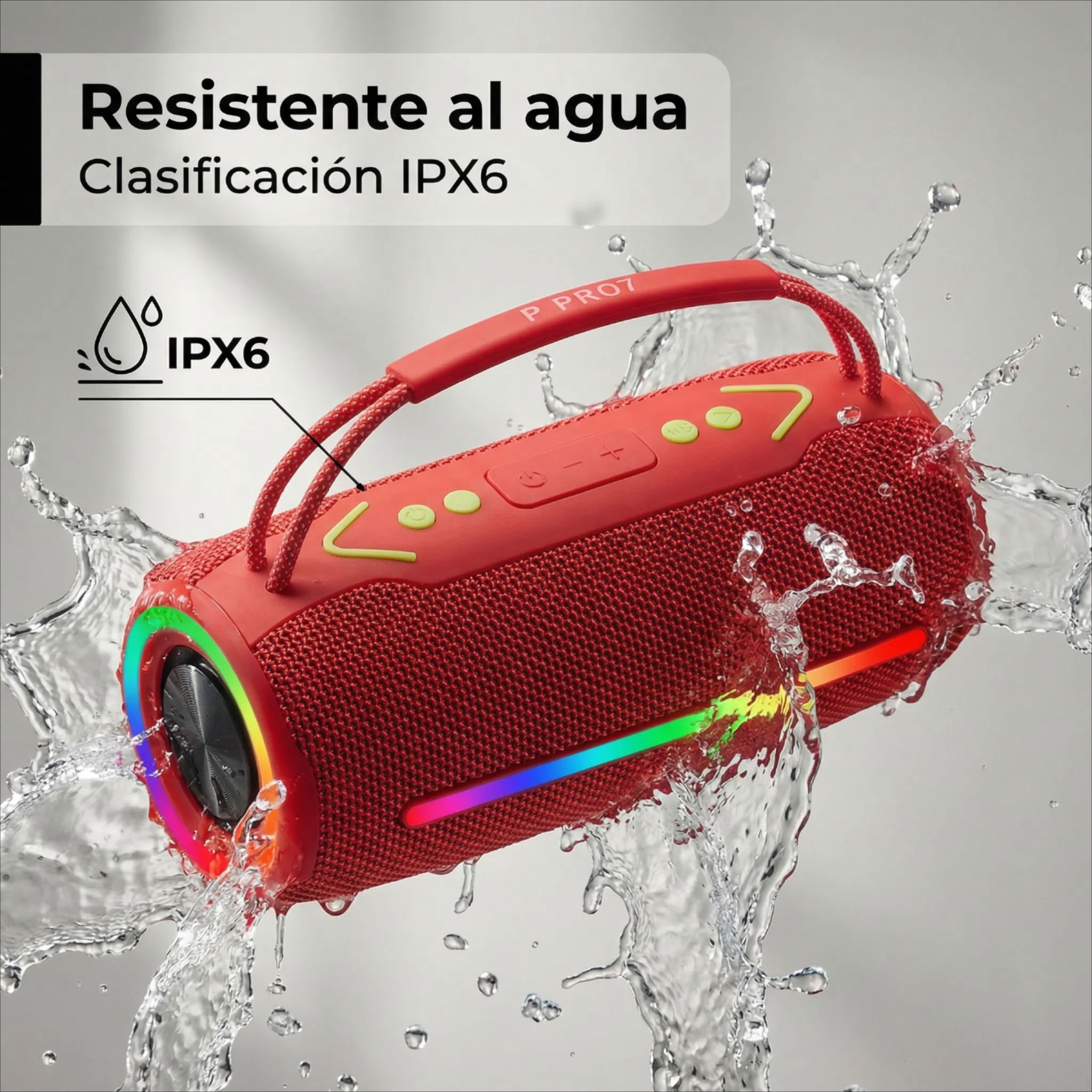 El altavoz Bluetooth JBL P PRO 7 posee una clasificación de resistencia al agua IPX6, que lo protege de la lluvia y las salpicaduras, siendo un compañero confiable para aventuras al aire libre y fiestas. Hereda el sonido clásico de JBL, ofreciendo un rendimiento de sonido potente y robusto.