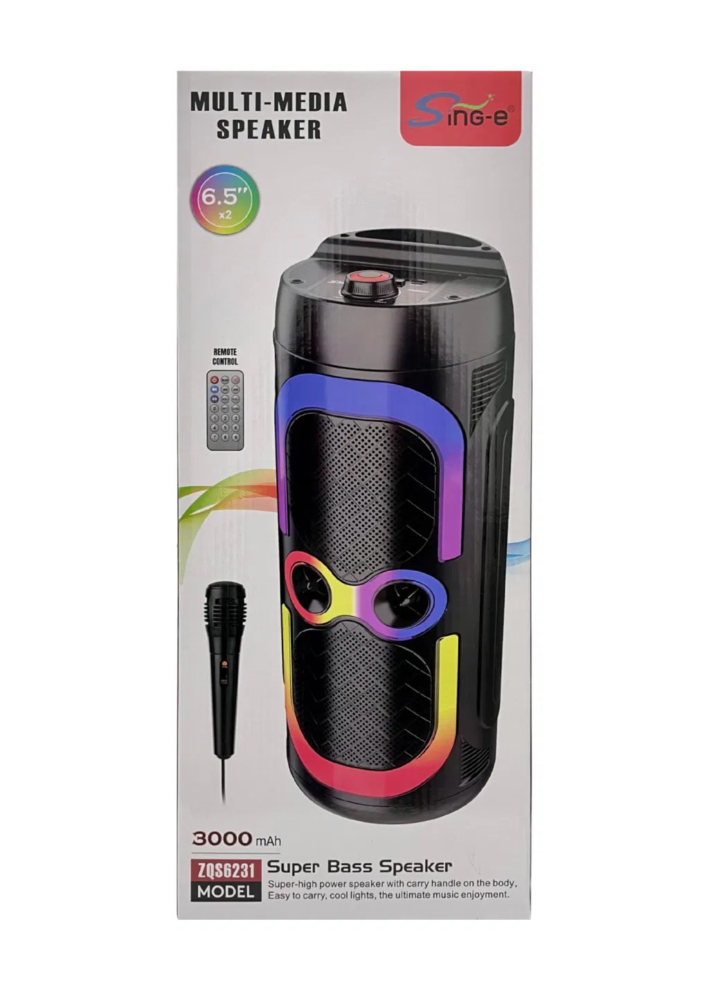 El altavoz Bluetooth portátil de alta potencia para baile en plaza de la marca SING-E, modelo ZQS6231, número de modelo MG2525, es un equipo de sonido todo en uno diseñado específicamente para uso en exteriores. Combina salida de sonido de alta potencia, conexión Bluetooth, reproducción con tarjeta SD, entrada de micrófono, y es adecuado para baile en plazas, propaganda al aire libre, fiestas y diversas ocasiones. El altavoz también está equipado con luces RGB geniales para mejorar el ambiente visual.