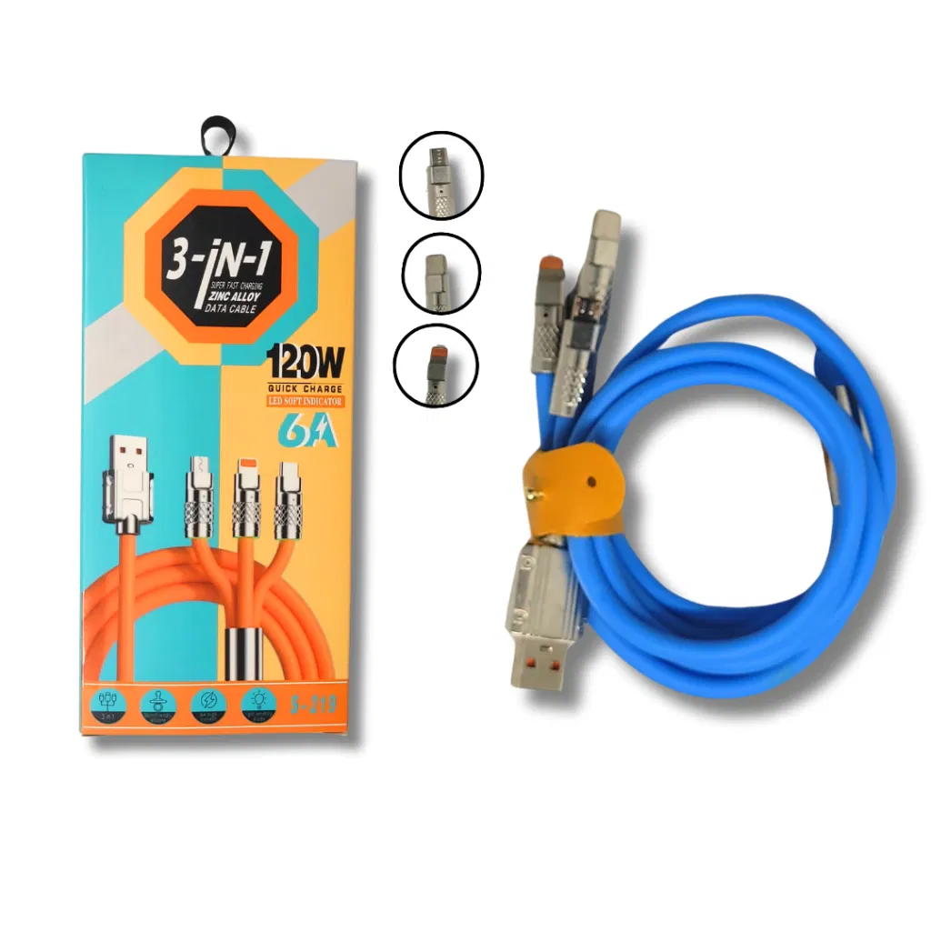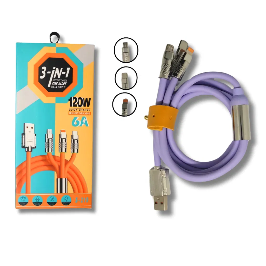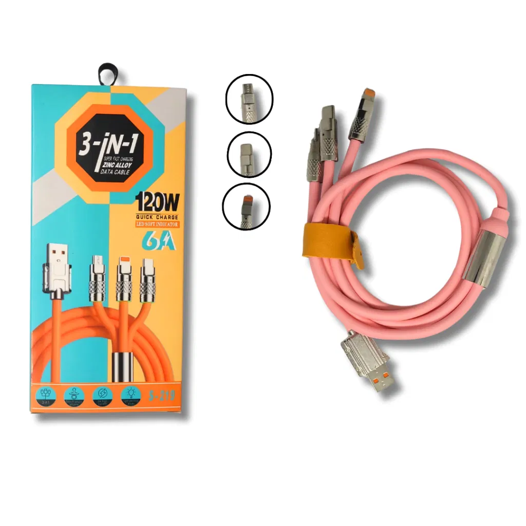 El cable de carga rápida, modelo S219, número de modelo MG3097, es un cable multifuncional 3 en 1 de alto rendimiento. Integra tres conectores: USB a Lightning, Micro USB y Tipo-C, y soporta hasta 120W de potencia y 6A de alta corriente para carga rápida. Utiliza conectores de hierro robustos, más resistentes al desgaste y duraderos, satisfaciendo las necesidades de carga rápida y transferencia de datos para varios dispositivos.